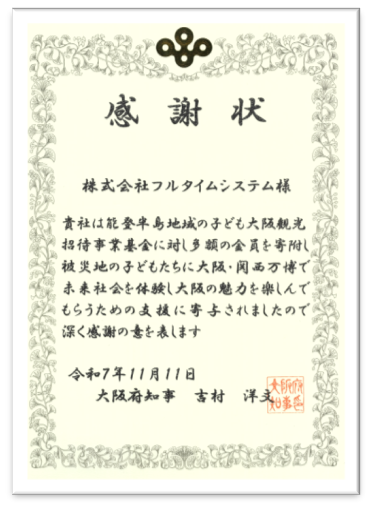 フルタイムシステム、大阪府知事より感謝状を授与 大阪府「能登半島地域の子ども大阪観光招待事業」を支援 ~能登半島の子どもたちに夢の大阪体験を実現~ 2025.11.12